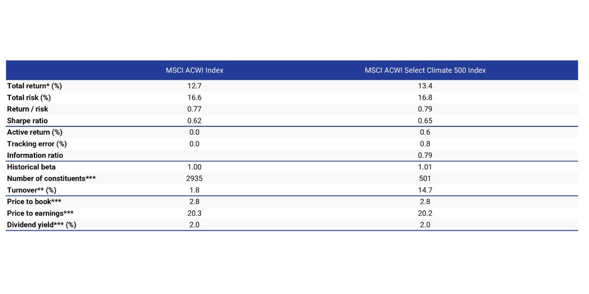 Based on the backtested index performance from June 30, 2020, to June 4, 2024,2 the MSCI ACWI Select Climate 500 Index returned 13.4% (compared to 12.7% for the MSCI ACWI Index) and had a Sharpe ratio of 0.65 (compared to 0.62 for the MSCI ACWI Index).