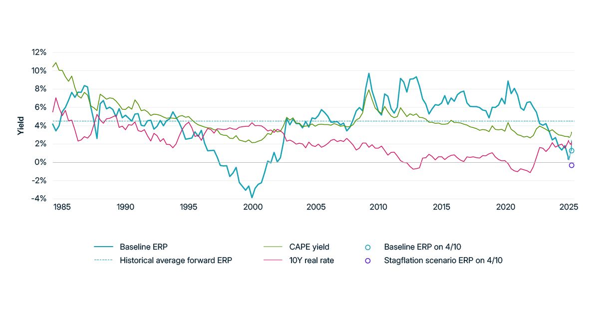 If tariffs bring modestly lower growth and higher inflation, the model suggests U.S. equity is an additional 15% overvalued. But drawdowns greater than 40% could arise if we see worse stagflation or if the equity risk premium goes to the levels of previous crises.
