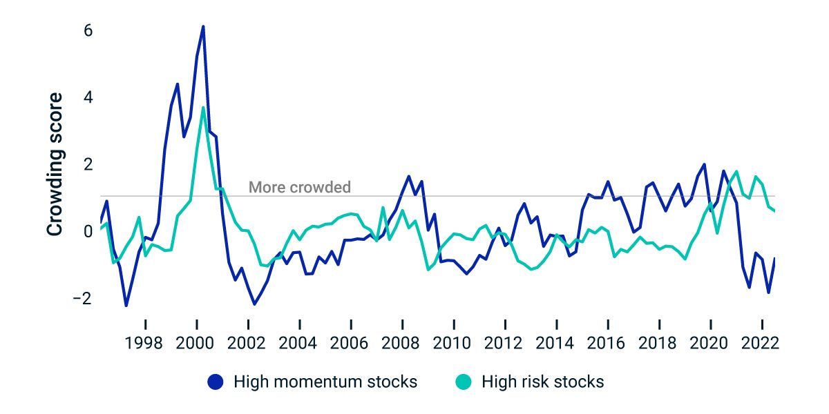 The U.S. stock market has plunged 15% to start the year, while growth stocks have fallen even farther. Many firms are suffering through historic drawdowns and a resetting of their valuations. How can investors make sense of it? Is there a commonality behind those firms whose fortunes have changed so quickly? The answer may lie, at least in part, with crowding. As we highlighted in previous research, the riskiest and the highest momentum stocks were also some of the most crowded at the end of 2020. Since then, investors fled these firms on news of slowing GDP, rising inflation and the Russia-Ukraine war. The selloff might not be complete, but the crowds are already much thinner. The MSCI Factor Crowding Model shows that the riskiest stocks are still slightly crowded today, but far less so than they were at their peak. Additionally, the turnaround in high momentum stocks has been so sharp that they are now less crowded than they have been in over a decade. Crowding is one important measure investors can look to in fast-moving markets.