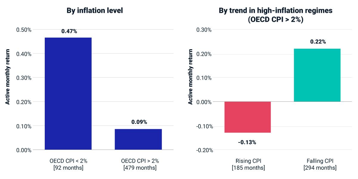 “Active monthly return” is the monthly return of the MSCI World Small Cap Index compared to the monthly return of the MSCI World Index. Rising/falling inflation regimes are defined by the sign of 36-month minus three-month OECD CPI. Through December 1998, we used the MSCI World Equal Weighted Index returns to proxy small-cap performance. Data is from December 1975 through June 2023.