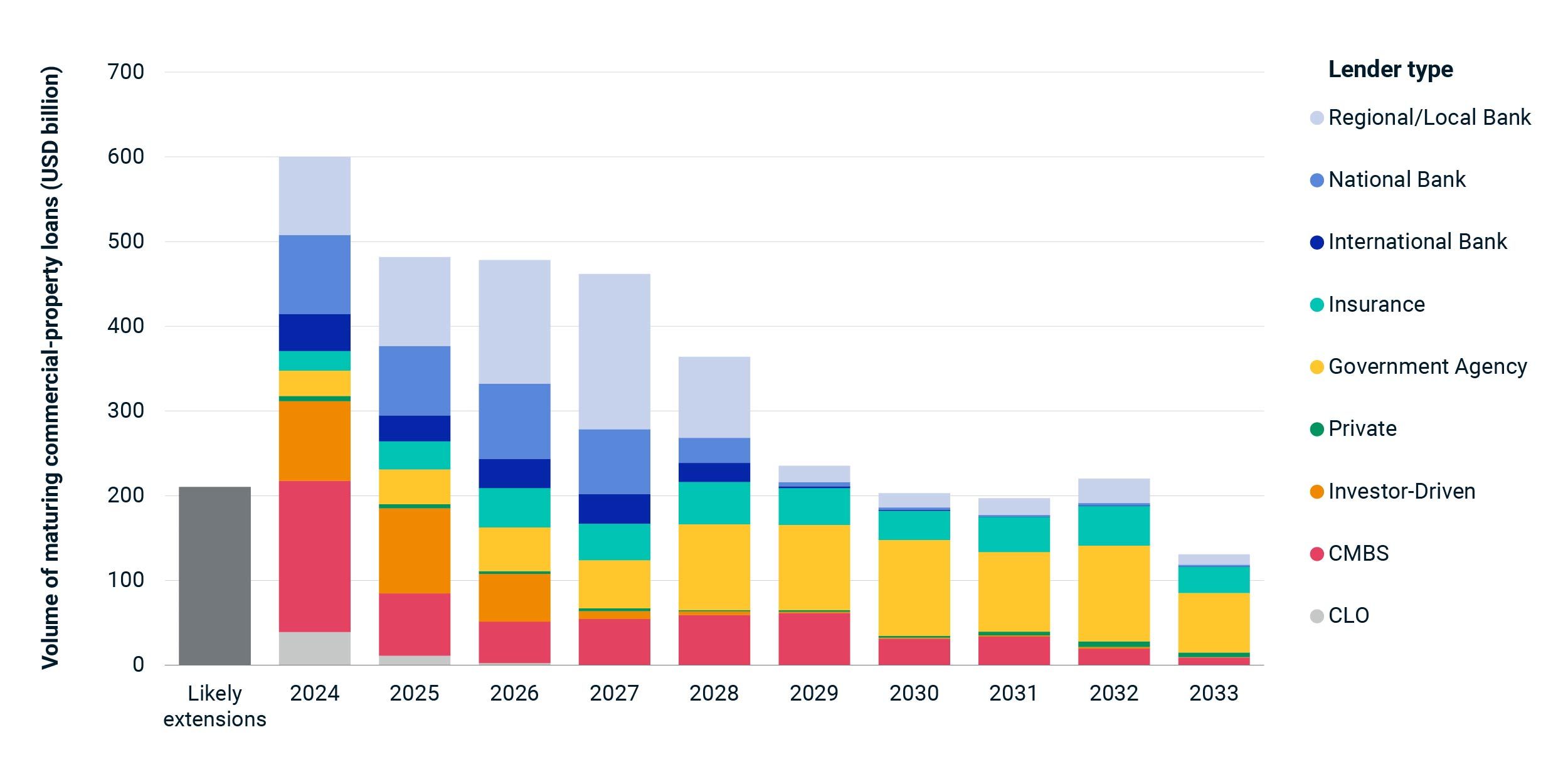Close to USD 820 billion of U.S. commercial-property loans could mature in 2024, coming due after a broad decline in property prices and sharp increase in borrowing costs that may stymie the refinancing of some mortgages. Loans maturing in 2024 total around USD 600 billion, according to MSCI Mortgage Debt Intelligence data. Additionally, USD 214 billion of loans were slated to come due in 2023 but, according to our analysis, were not subsequently refinanced and no sale of the associated collateral occurred; we have deemed these loans "likely extensions."