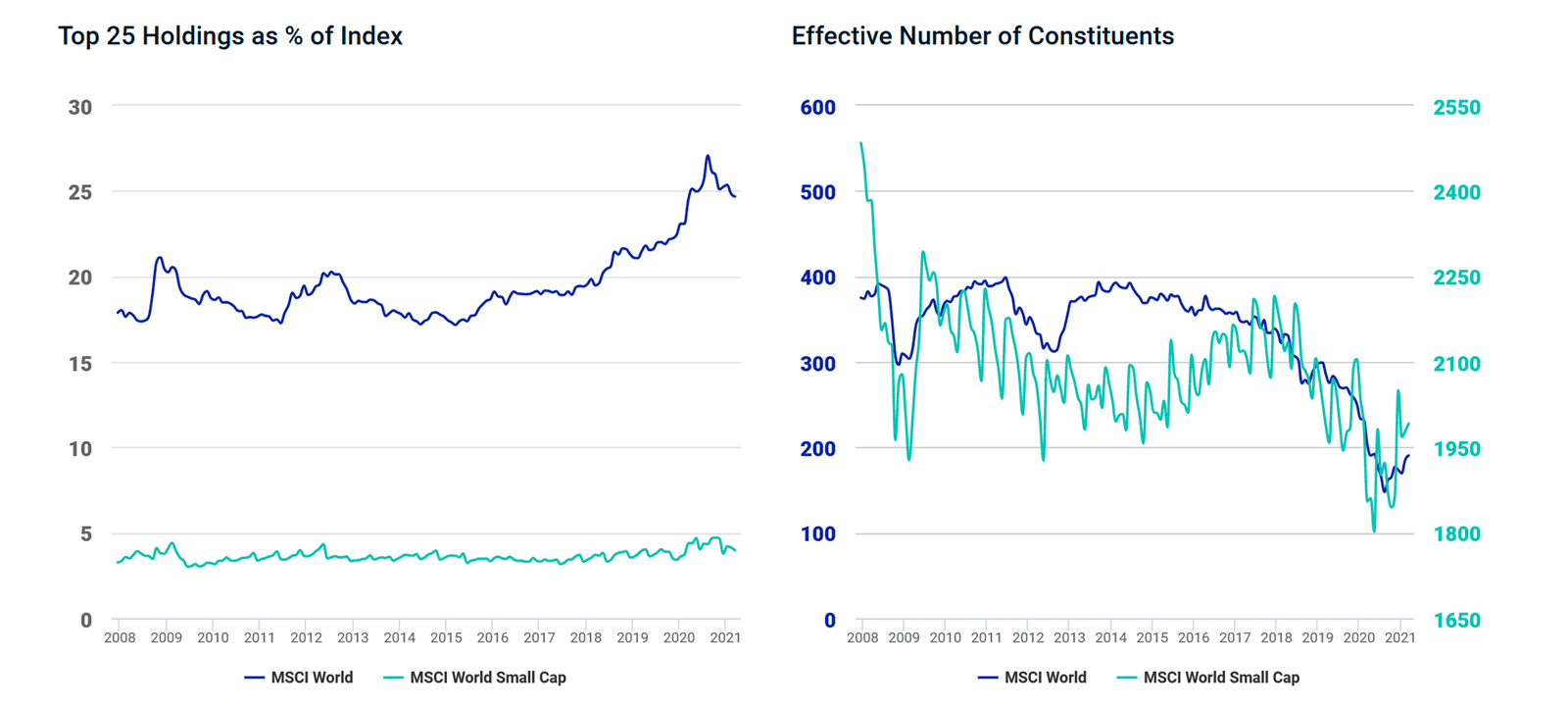 A few weeks ago, we looked at the historical and current concentration of a range of regional indexes and noted there had been an increase in concentration across the globe. But what about small-cap indexes, specifically? Looking again at the percentage of the largest companies in the index and the effective number of stocks, this time for the MSCI World and MSCI World Small Cap Indexes, we can see in the charts below that both measures indicated a higher level of concentration for MSCI World compared to MSCI Small Cap. As a recap, the effective number of stocks indicates how many stocks are "effectively" driving an index vs. the total number of index constituents. The bigger the difference between the effective number and the number of index constituents, the more concentrated the index. For the period in review, the MSCI World Small Cap Index had an average of 3,464 constituents, while the effective number was 1,744 (just over half of the average). The MSCI World Index, on the other hand, had an average of 1,646 constituents and an effective number of 319. Regardless of location, when an index is more concentrated, its performance and risk will be dominated by a smaller number of names.