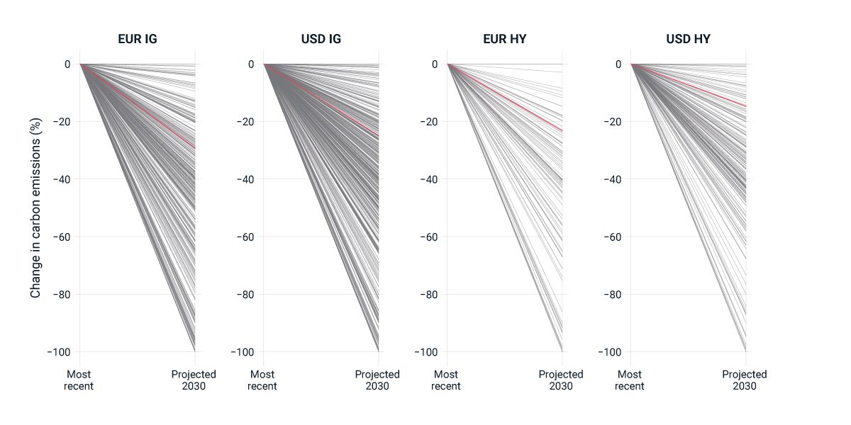 Each gray line in the plot above represents the carbon emissions at issuer level. The red line represents the average. Data from the constituents of the EUR- and USD-denominated MSCI Investment Grade (IG) Corporate Bond Indexes and MSCI High Yield (HY) Corporate Bond Indexes.
