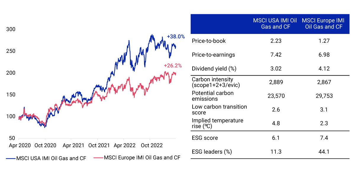 Since the end of the U.S. recession in April 2020, companies in the oil, gas and consumable-fuel industry have rallied and outperformed broad equity markets across the globe. Moreover, U.S. firms have outperformed their European counterparts, as measured by the MSCI USA IMI Oil Gas and Consumable Fuel Index's returning 11.8% per year more than the MSCI Europe IMI Oil Gas and Consumable Fuel Index over the last three years in gross USD terms. For context, the long-term (April 2013 – April 2023) performance of the two indexes have been quite similar at 5.2% and 5.0% per year, respectively. At the same time, the European companies, on average, exhibited higher low carbon-transition scores and better ESG profiles, indicating they may be more resilient to climate risks and potentially positioned to benefit from climate-related opportunities.