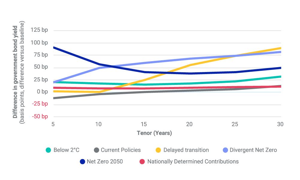This interactive plot shows how decarbonization could affect government-bond yields and macroeconomic variables across five major countries.