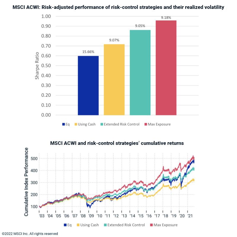 In the exhibits below, we compare the risk-adjusted and absolute performance of simulated risk-control approaches, highlighting three key takeaways: