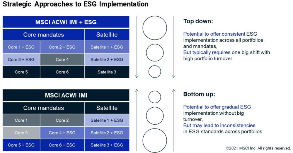 We use a "bottom-up" implementation, a gradual, mandate-by-mandate approach that leaves the policy benchmark unchanged, and a "top-down" implementation, which is a more holistic approach that applies views across all policy, systematic indexed and active mandates. And, we unite several tools — the ESG characteristics of mutual funds, a risk model that incorporates an ESG factor and ESG indexes — to highlight how indexed and active management can be complementary.